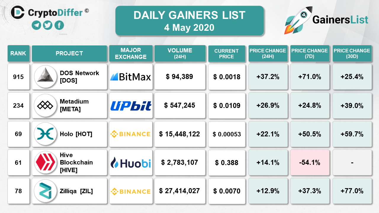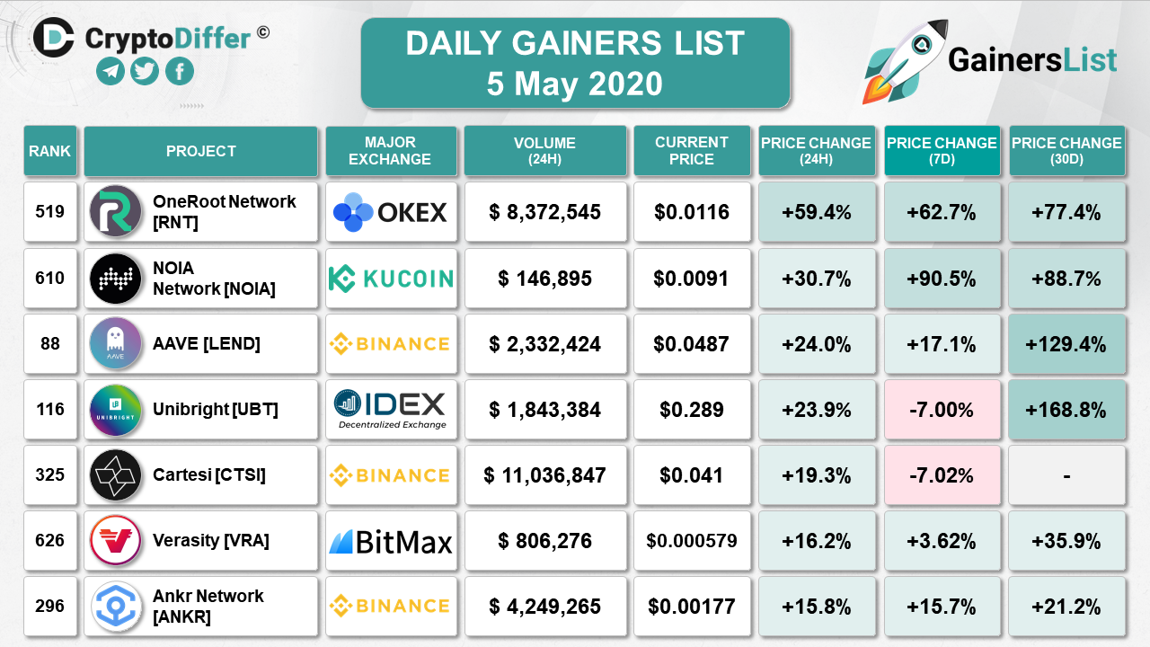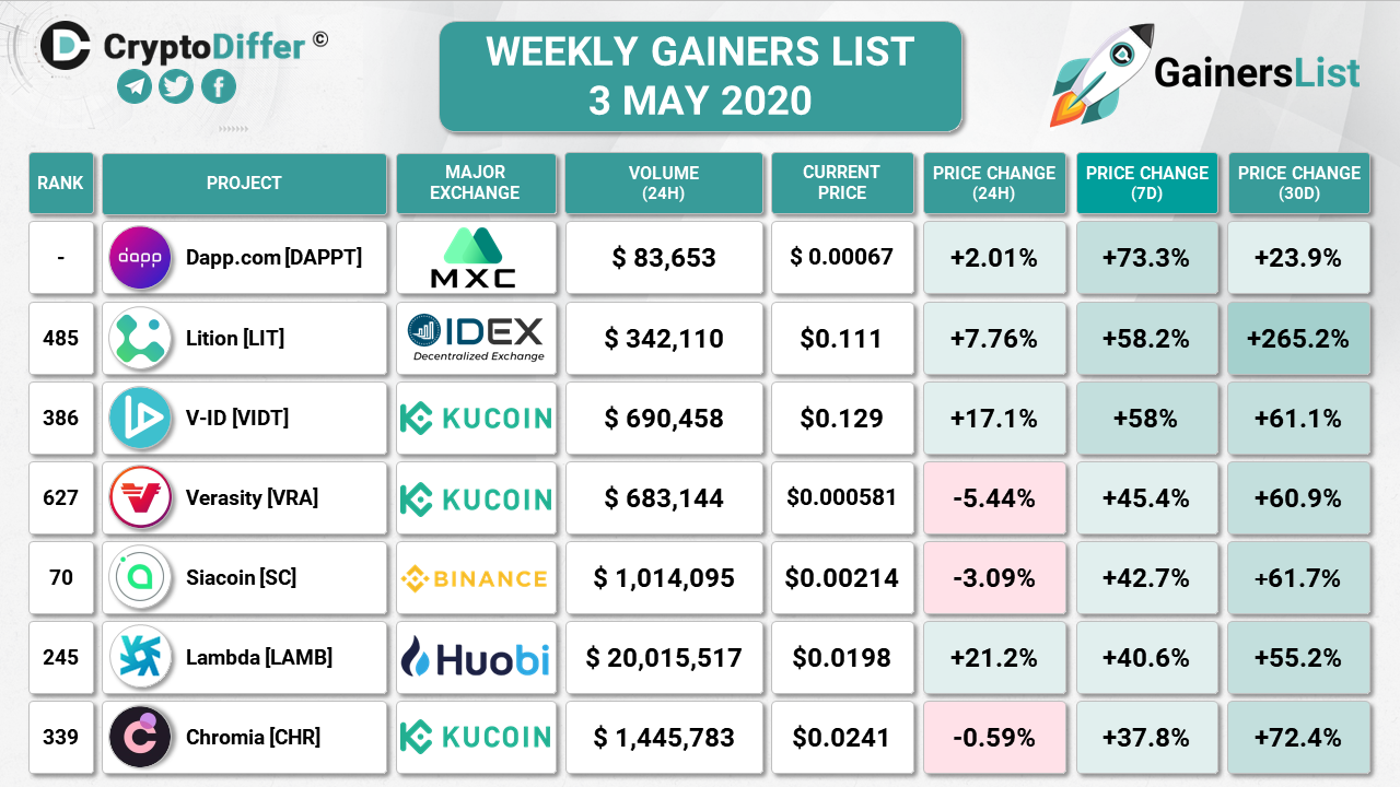 Top 5 are Unibright (+1609%), CyberVein (+586%), Streamr DATAcoin (+515%), Lition (+413%), and BHEX Token (+395%)