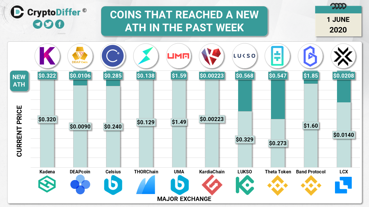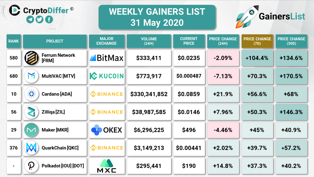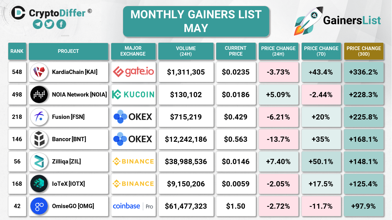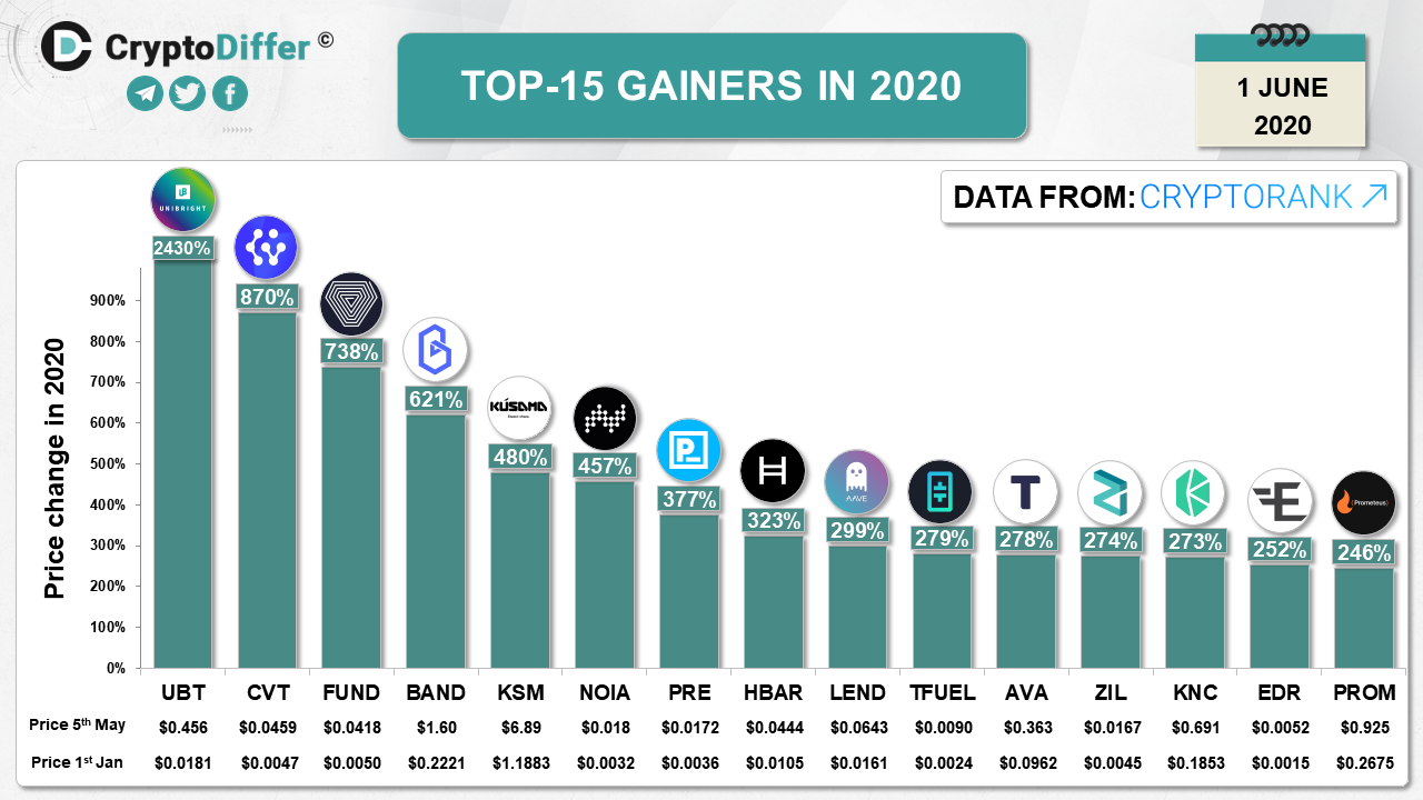 Top 5 are Unibright (+2430%), CyberVein (+870%), Unification (+738%), Band Protocol (+621%), and Kusama (+480%)