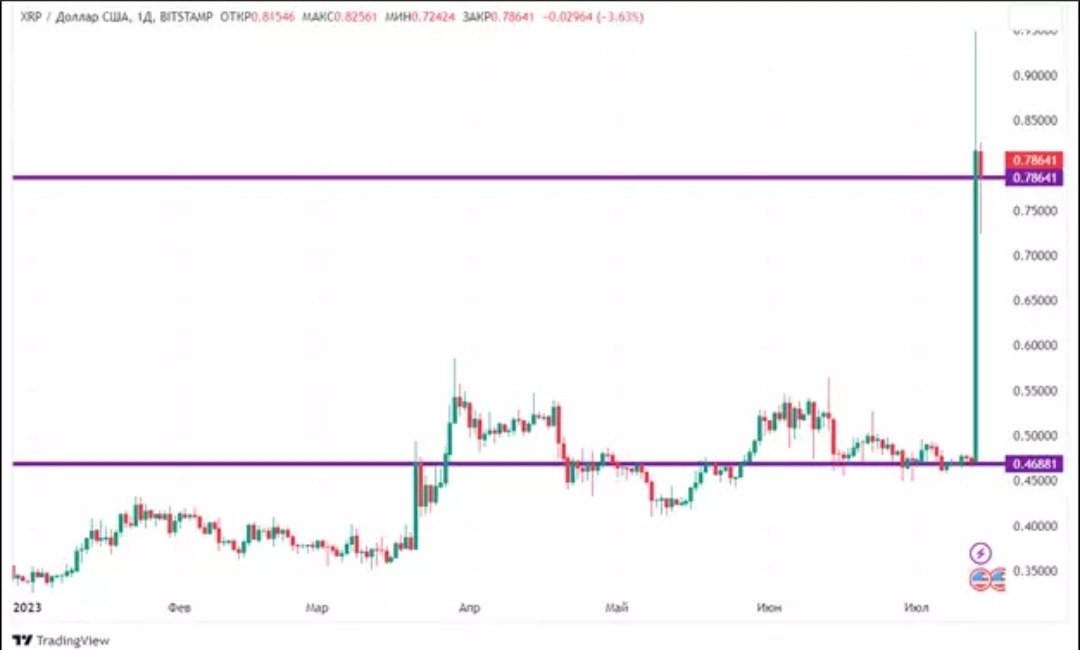 Криптовалюта Ripple за неделю с 7 по 14 июля прибавила в цене умопомрачительные 68%. По сути, весь рост пришелся на один день, четверг, 13 июля, когда токен XRP за несколько часов вырос более чем на 73%. Тогда как раньше цена колебалась в узком диапазоне между $0,45 и $0,48.