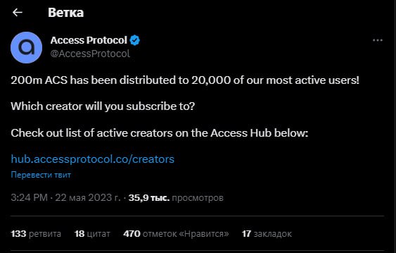 📝Access Protocol анонсировали, что раздали по 10к токенов (≈40$) самым активным своим пользователям, знаю точно, что моему знакомому пришел дроп на 10к токенов, он получал лишь дроп через CoinGecko