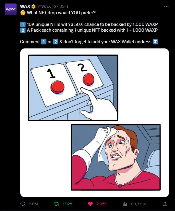 • Идем в Twitter и в комментариях кидаем адрес кошелька (он заканчивается на .wax) лайкаем и делаем репост данной публикации