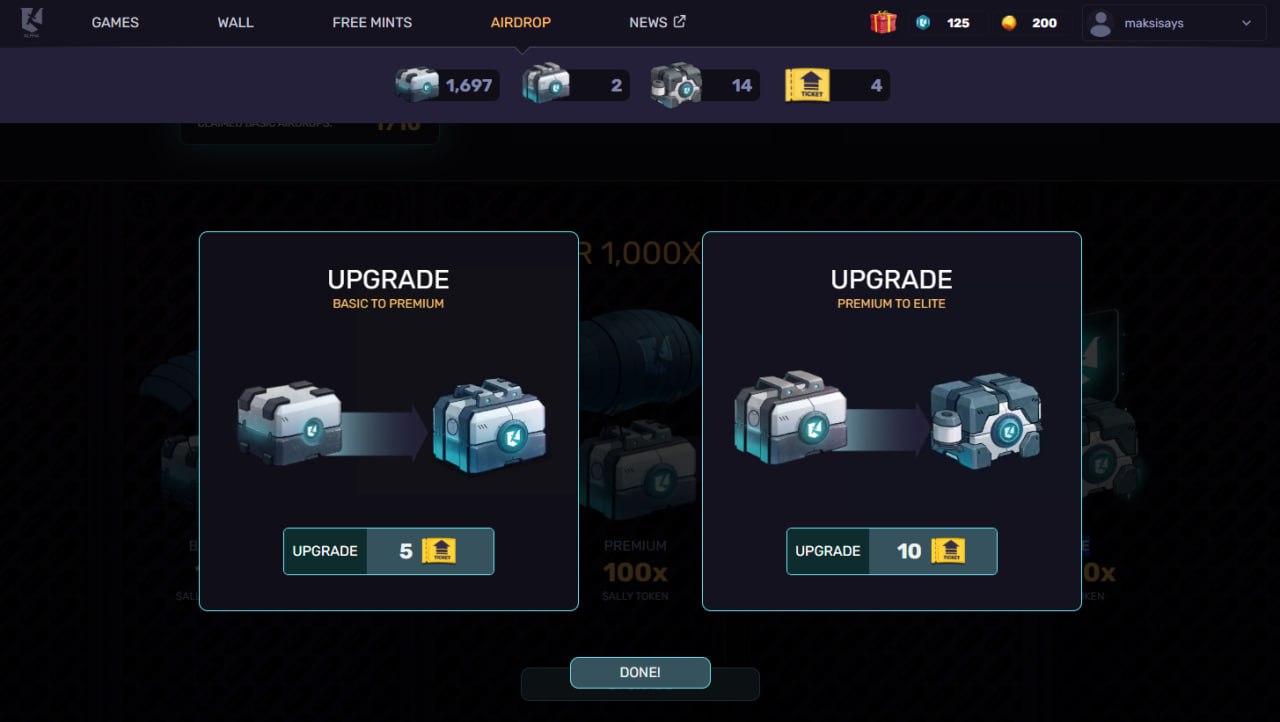 • В разделе "Airdrop" мы можем обменять кейсы (это не сундуки, другое их дают за рефералов и регистрацию (35 где-то) и 50 за реферала. В этих кейсах будут токены, за билеты которые нам падают мы будем прокачивать сами кейсы: Basic кейс - х1 дроп, Premium кейс - х100 (5 билетов прокачка), Elite - x1000 дроп (10 билетов)