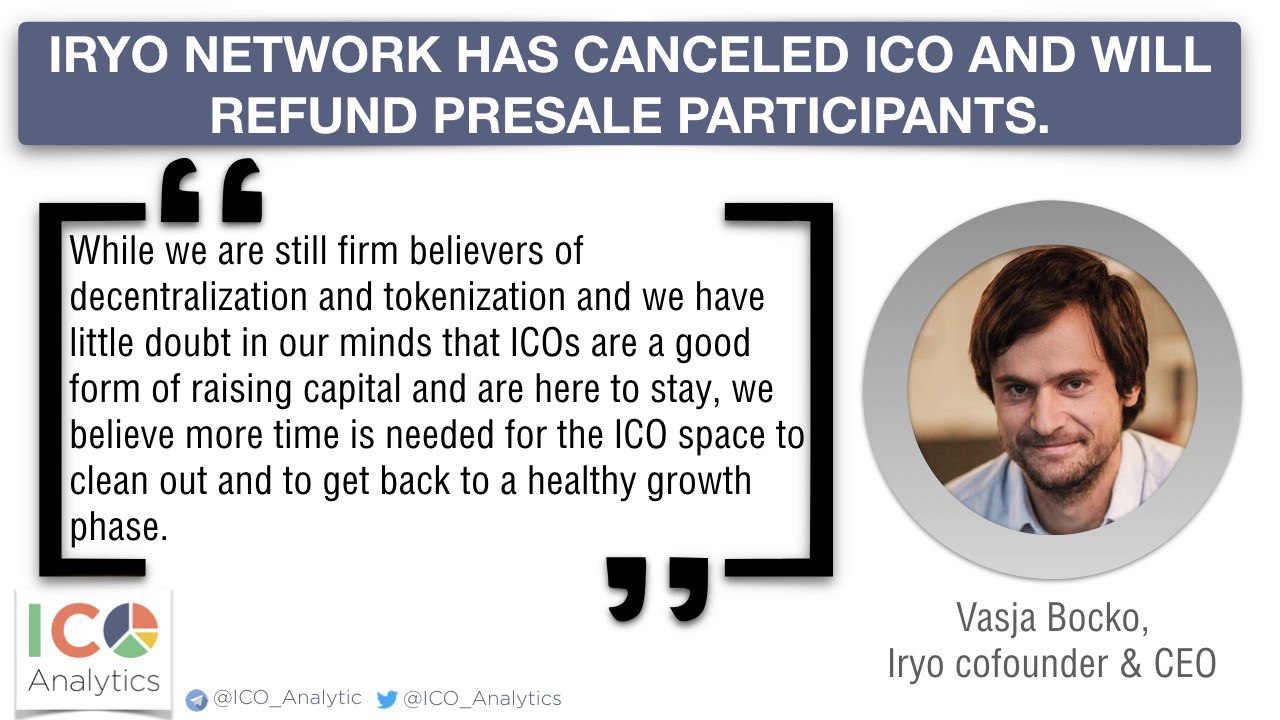 Iryo Network has canceled ICO and will refund presale participants. Earlier in September TxHash has canceled its Initial Coin Offering.