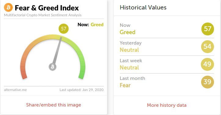 Индекс страха и жадности сегодня находится на уровне - 57. Вот уже пару дней индекс растет и дошел до уровня "Greed".