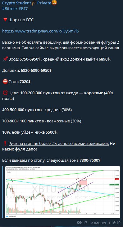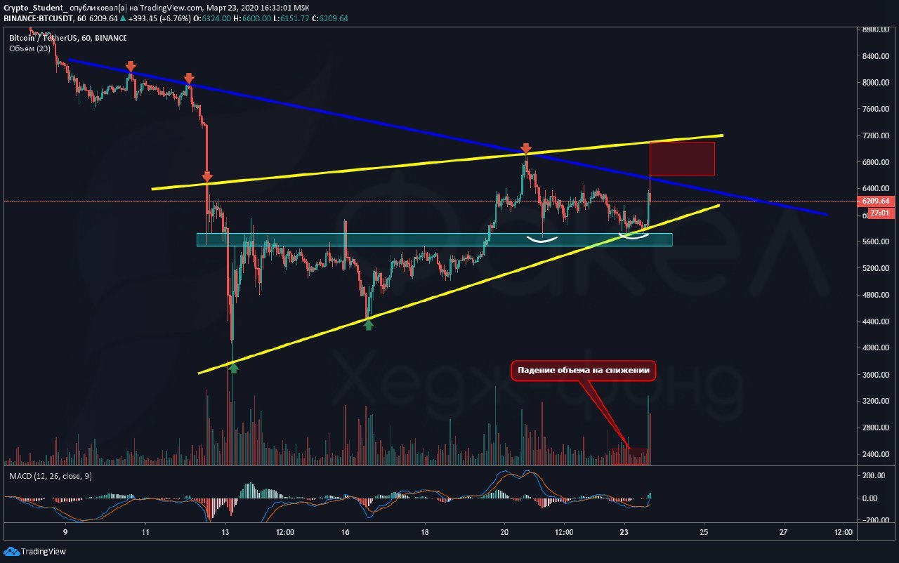На данный момент сопротивлением служит зона 6600-7100$, как раз там проходит глобальная линия сопротивления (6600$) и верхняя граница восходящего клина (7100$).