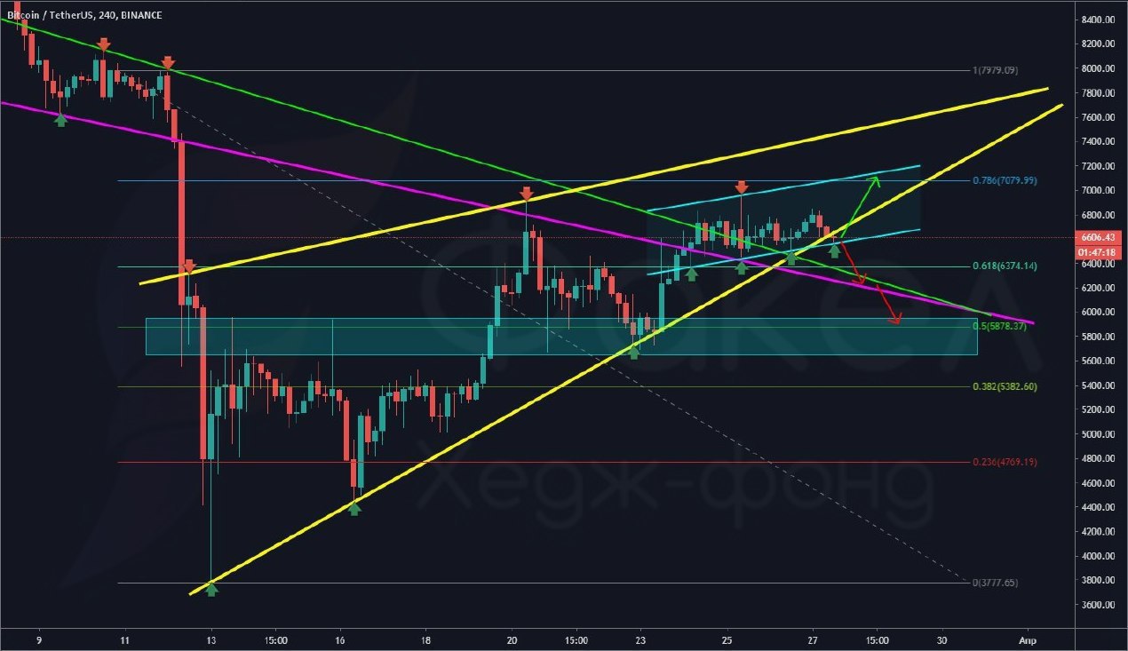 📈За рост. Важно закрепляться выше 6600-6700$ и идти в зону 7000-7200$, где проходит верхняя граница глобального клина.