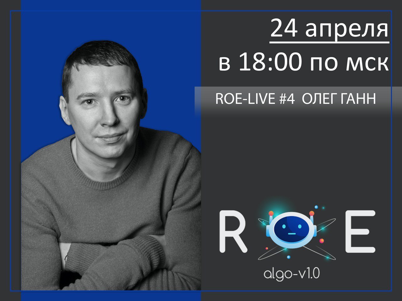 Трансляция состоится в пятницу, 24 апреля в 18-00 по МСК на канале ROE ALGO v.1.0 Свои вопросы Олегу вы можете задать у нас в чате!