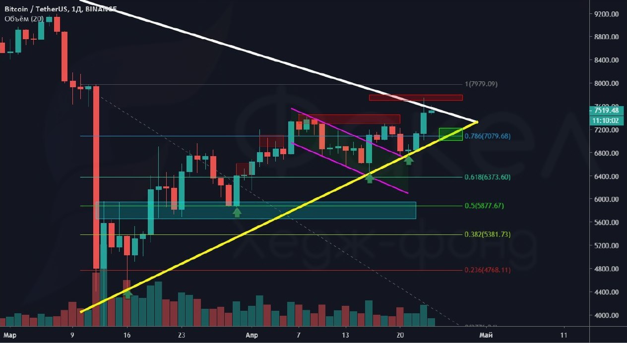 Если биткоин сможет закрепиться выше данных уровней, то есть вероятность уйти выше 7800$, в район 8200$ и выше, именно там проходит глобальный уровень сопротивления от 10500$ (белая линия на графике).