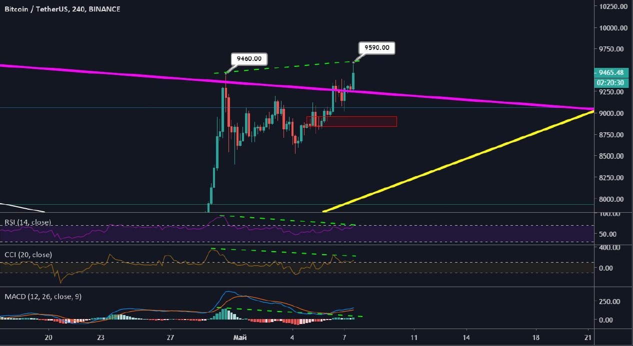 Первая криптовалюта достигла нового максимума в 9590$, тем самым образовав медвежьи дивергенции на часовых таймфреймах.