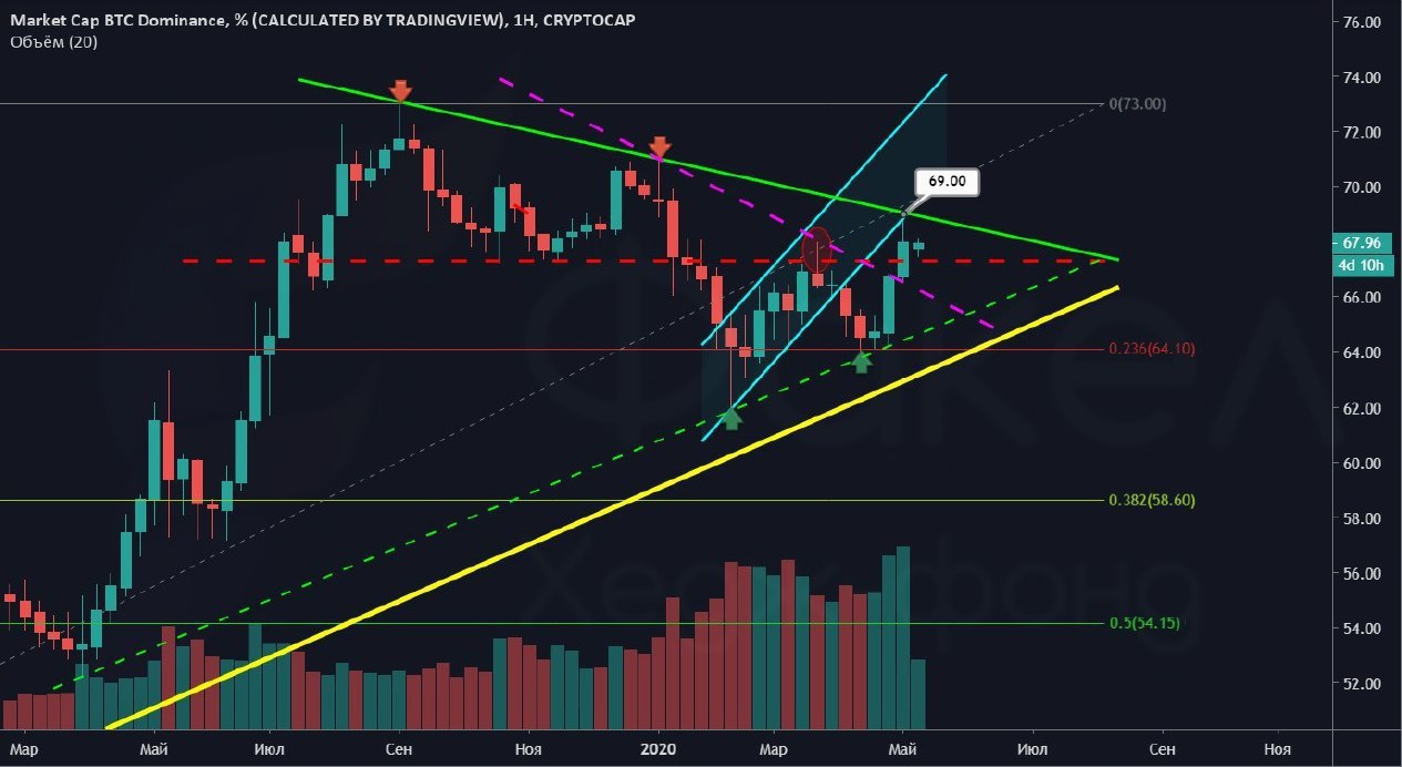 3️⃣ Ударились о ключевой уровень 69%, где проходит глобальная линия сопротивления (зеленая) и нижняя граница пробитого восходящего канала. Сейчас рисуем нисходящий канал на дневном таймфрейме.