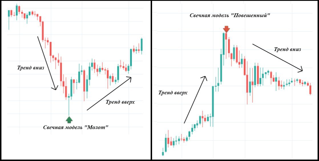Так же, следует брать во внимания свечные модели «Молот» и «Повешенный», только если они образовались на продолжающемся тренде, появление которых сигнализирует о его завершении.