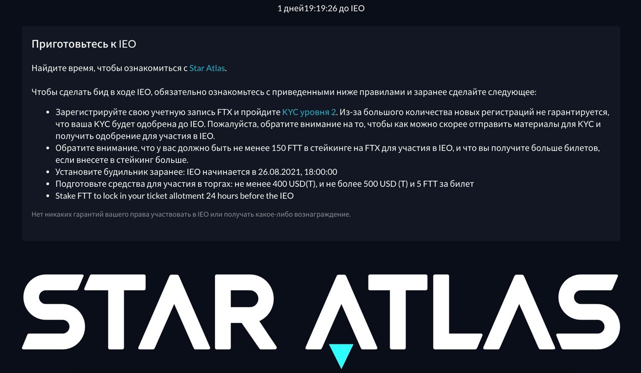 Как вы знаете с недавних пор начал торговать на бирже FTX. На днях биржа проводит новое IEO проекта Star Atlas! И я решил в нем участвовать)