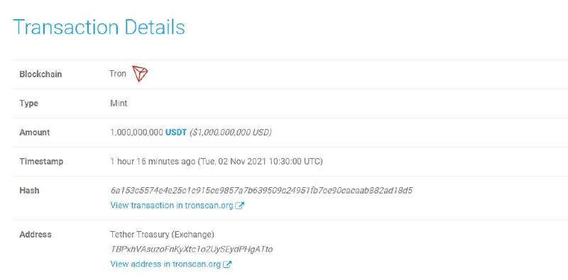 ​​Сегодня был напечатан Tether в размере 1 миллиарда долларов