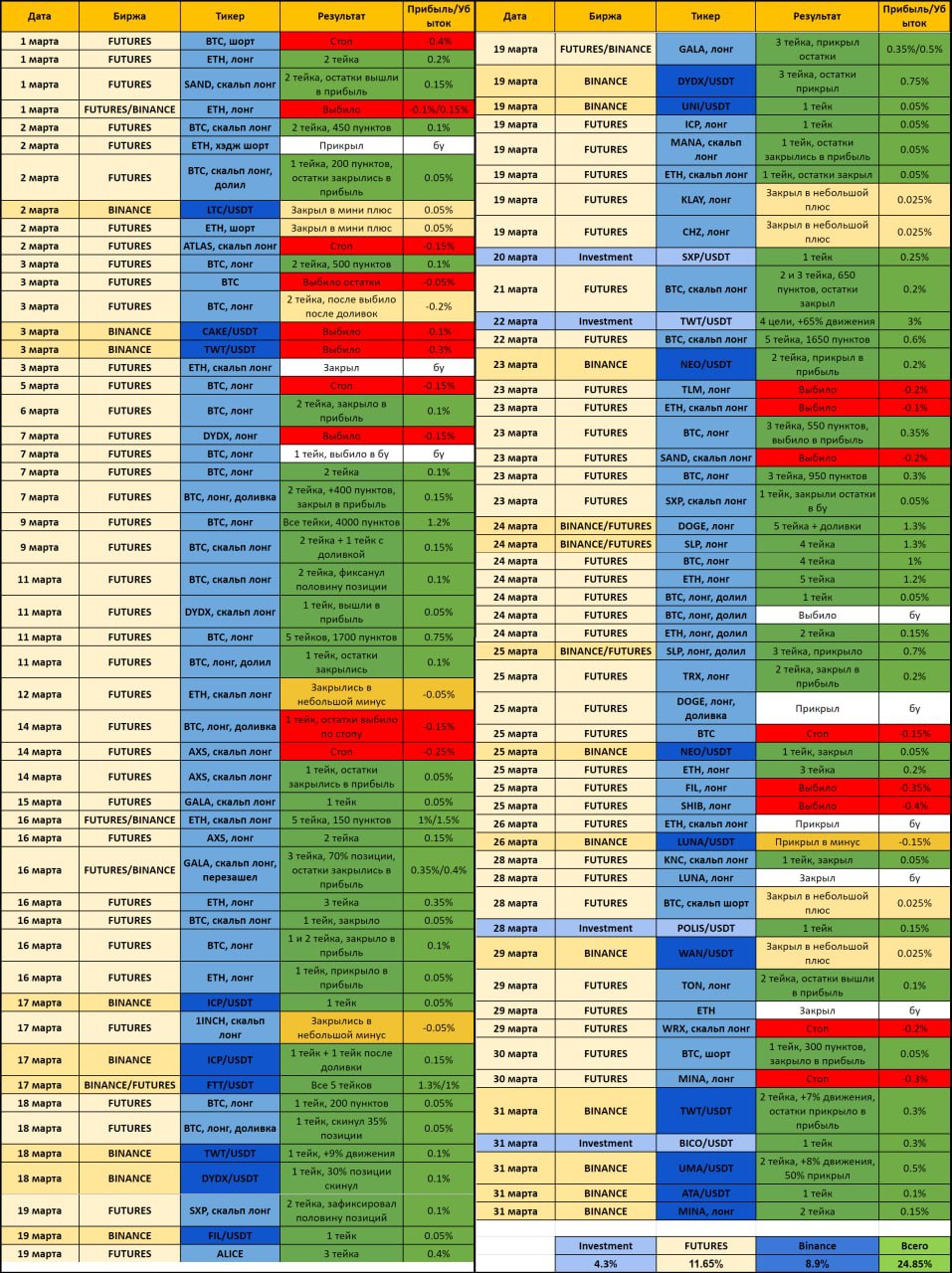 Сrypto Student🎓| Ильяс Шарипов pinned «❗️Друзья, минутку внимания! 🗓По традиции хочу предоставить вам отчет работы нашей приватной группы, с 1 по 31 марта! По итогу: ▫️Binance (спот) — +8.9% депозиту. ▪️Binance Futures — +11.65% к депозиту. ▫️Investment - 4.3% к депозиту. Всего: +24.85%.…»