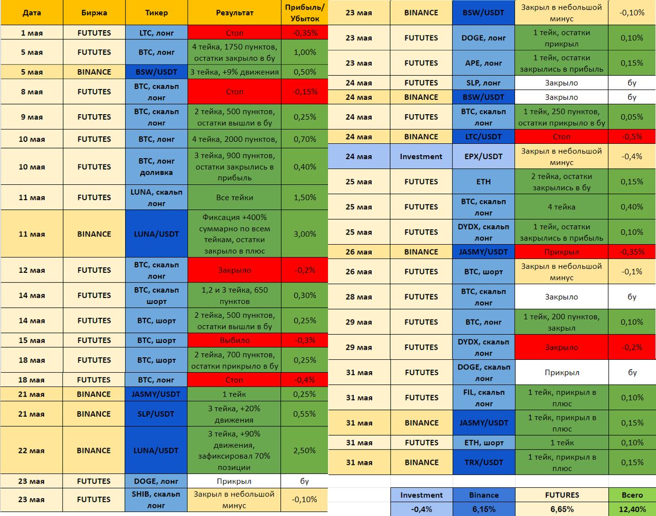 ⭕️Месяц прошел довольно хорошо, несмотря на унылый флет. Забрали неплохие движения по битку и альтам. Примечательным были лонги по #LUNA, в котором зафиксировали 300-400% движения!