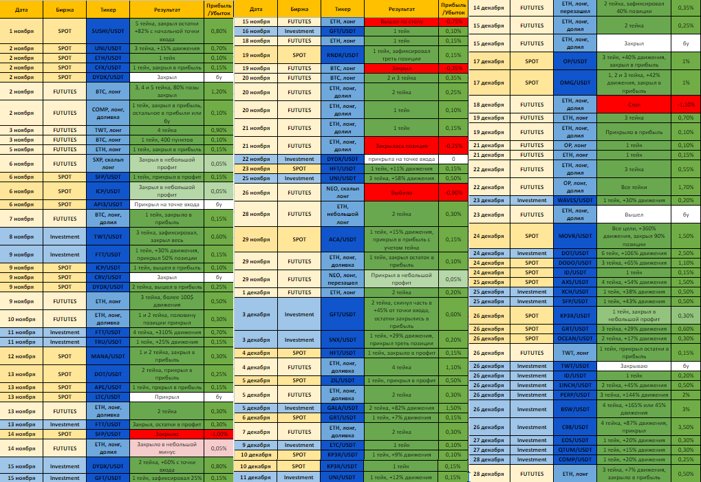 ⭕️В ноябре и декабре удалось отлично заработать, забрали много крупных движений, как по 30-50%, так и по х2-3 пампы. Прошли точно по плану, который говорил в начале ноября, где основную часть своих Лонгов я хотел закрыть при капитализации 800-850 млрд. $. Чего и достигли, забрав хороший прирост к депозиту💰