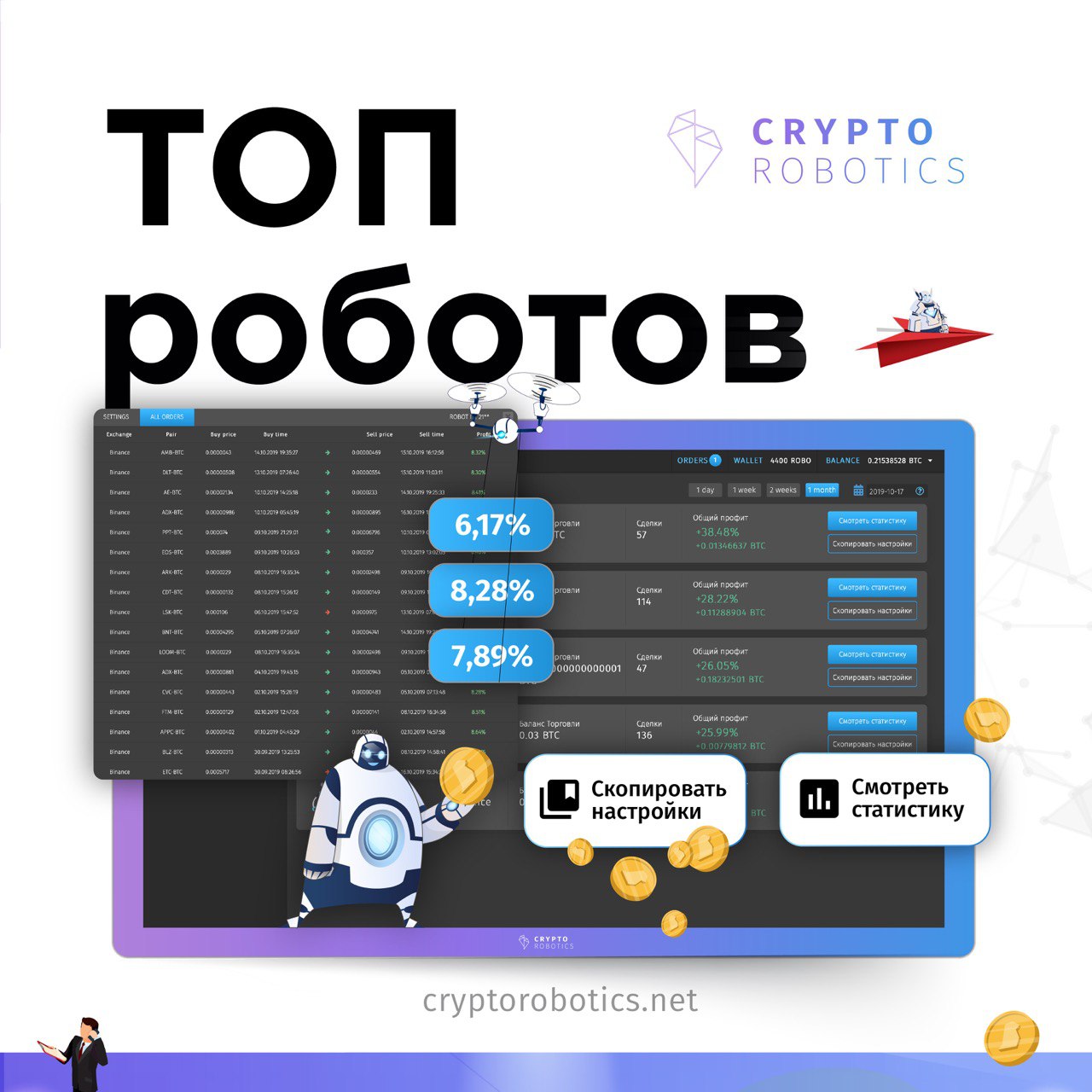 В терминале Cryptorobotics есть удобный ТОП роботов, в котором можно посмотреть статистики самых доходных роботов и скопировать их настройки в один клик. Вы всегда сможете узнать, куда перетекает ликвидность рынка и какой робот наиболее прибыльный именно сегодня, за неделю или за месяц.