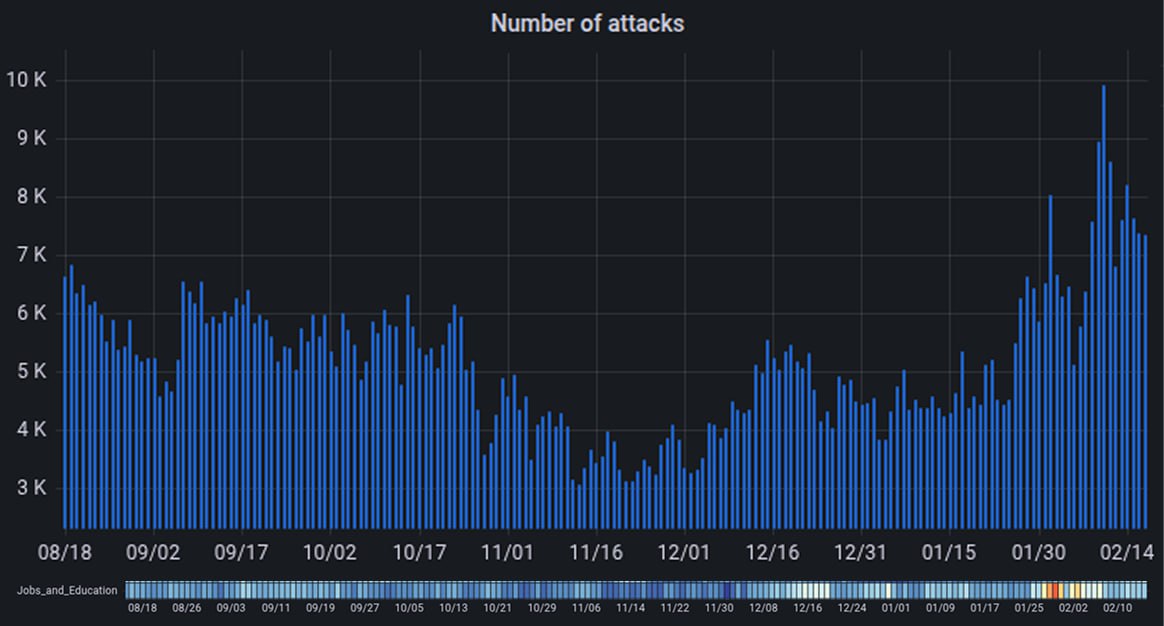📊С середины января фиксируем почти двукратный рост DDoS-атак на образовательные ресурсы и площадки по поиску работы.