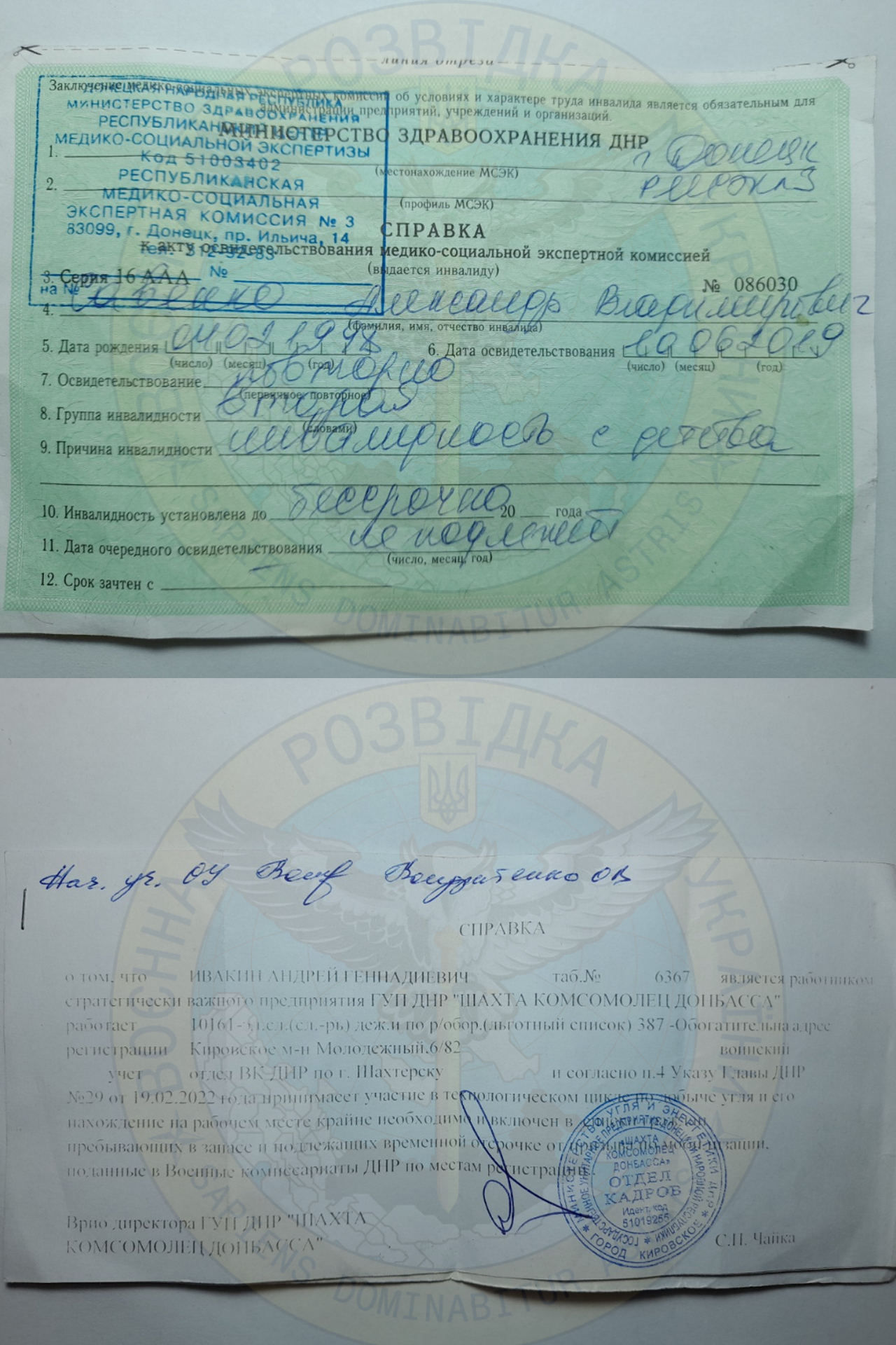 Документи осіб, що не підлягають призову, було знайдено серед паперів знищеного підрозділу так званої «армії ДНР». Зокрема, Олександра Савенка, інваліда дитинства, який не підлягав військовому призову. Або Андрія Івакіна, співробітнику шахти «Комсомолець Донбасу» із довідкою про те, що він працює на «стратегічно важливому підприємстві».