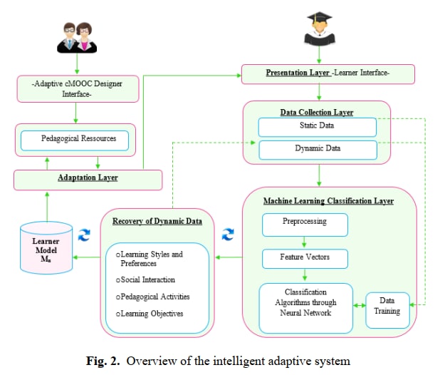 Авторы разработали адаптивную платформу cMOOC (Connectivist MOOC) для профиля каждого зарегистрированного учащегося. Сгенерированный профиль каждого учащегося обеспечит адаптивную навигацию и педагогическую деятельность. Интеллектуальная система, представленная в этой работе, сможет классифицировать учащихся в соответствии с их предпочтениями и стилями обучения.