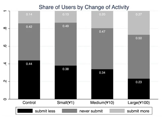 Результаты показывают, что те, кто получает денежное вознаграждение, с большей вероятностью сдают домашнее задание и получают более высокие оценки за домашнее задание. Далее авторы обнаруживают, что эффект сохраняется даже после того, как убираются денежные стимулы, и он распространяется на учебное поведение на других курсах в том же и последующем семестре.