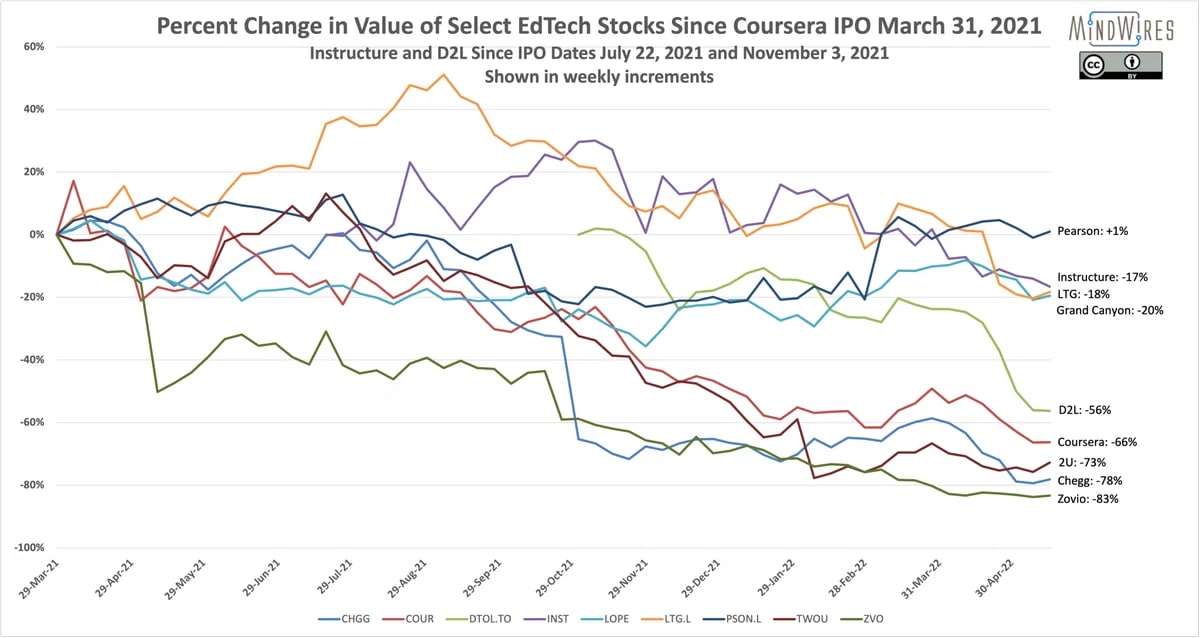Падение публично торгуемых акции EdTech компаний с прошлой весны повлияет не только на финансы компаний и инвесторов. Byju’s, индийский стартап онлайн-образования, ведет переговоры о приобретении компаний, нацеленных на рынок в США и,, вероятно, будет участвовать в торгах либо за Chegg Inc., либо за 2U Inc.. Это повлияет на школьное образование.