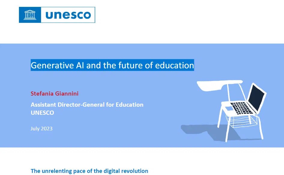 В начале июля ЮНЕСКО опубликовала новый документ «Генеративный ИИ и будущее образования» помощника Генерального директора ЮНЕСКО по вопросам образования Стефании Джаннини, в котором освещаются возможности и проблемы использования генеративных инструментов ИИ для обучения. В документе содержится призыв к срочным действиям «для обеспечения интеграции этих новых технологий на наших условиях». В ответах на вопросы о мире знаний, которые ставит ИИ, предлагается принять тот же процесс, который обычно применяется к образовательным ресурсам для использования в школах и для школьников.