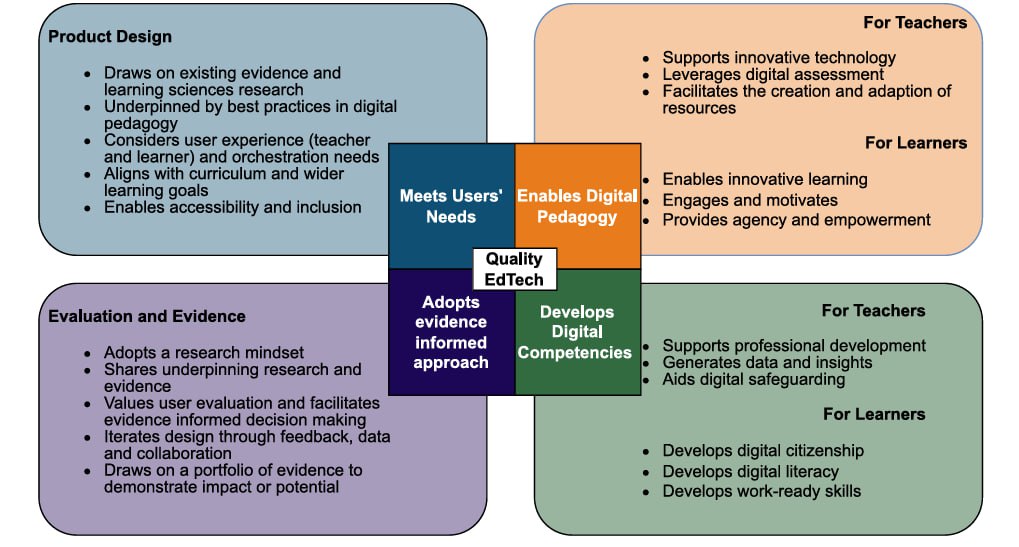 Анализ существующих структур и стандартов выявил некоторые ключевые характеристики, компоненты качества, существенные условия и критерии оценки для разработки и внедрения EdTech. Они были синтезированы в четыре общепринятые всеобъемлющие характеристики качества дизайна продукта EdTech.