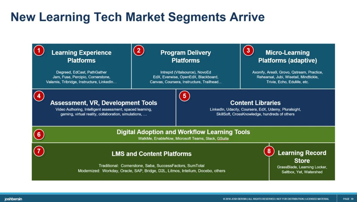 Рынок корпоративного обучения и образования (включая адаптацию, развитие лидерских качеств и соблюдение нормативных требований) составляет более 240 миллиардов долларов во всем мире, и 14% из них идет на технологии. Разнообразные мелкие и крупные компании гоняются за этим рынком стоимостью более 20 миллиардов долларов, и война становится еще более жарче, чем когда-либо.