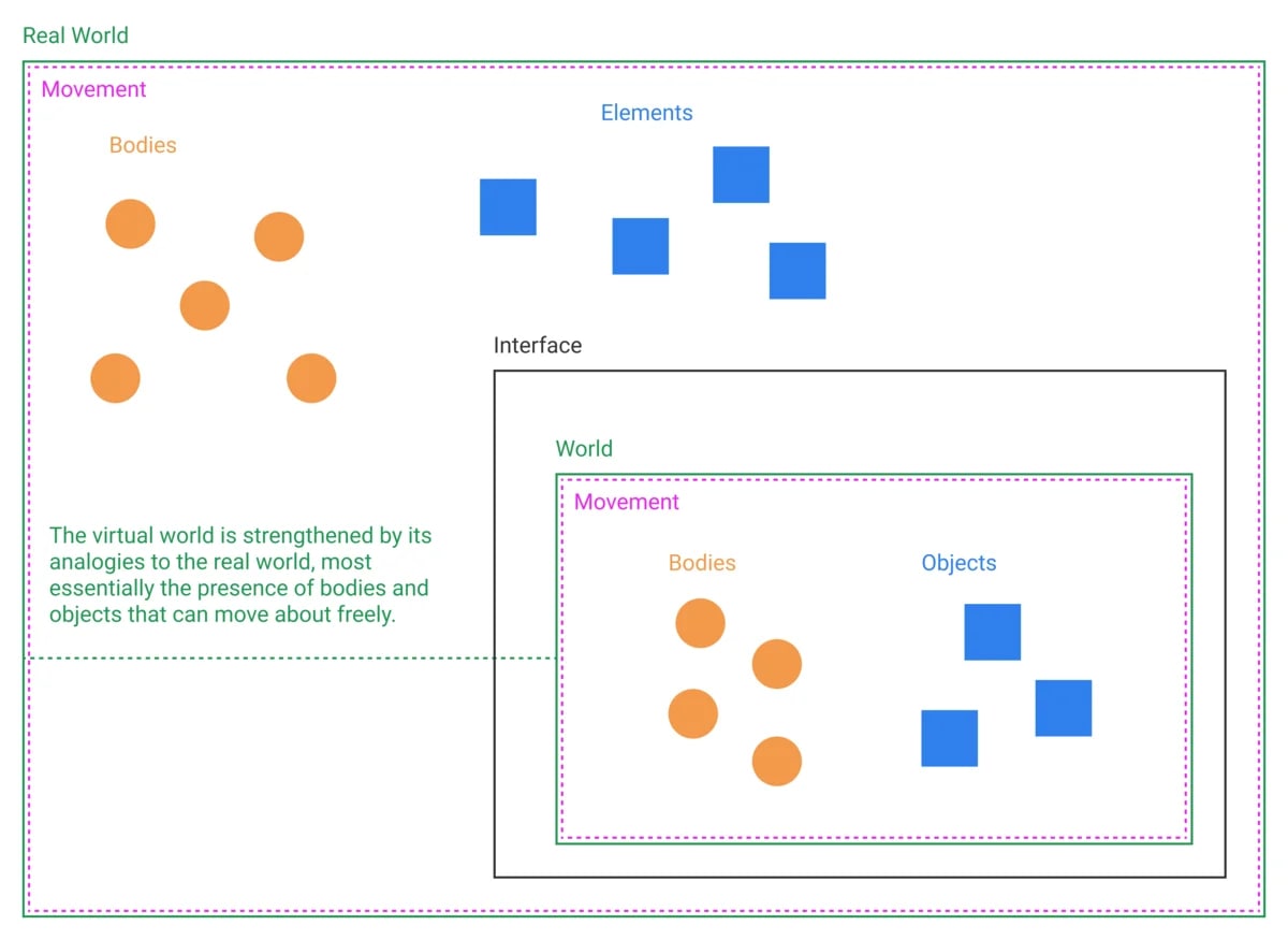Он характеризуется способностью свободно перемещать тела и предметы параллельно с реальным миром. Это отличает его от традиционного программного обеспечения, которое использует некоторую другую логику для организации своего интерфейса.