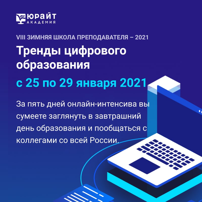 С 25 по 29 января 2021 года Образовательная платформа «Юрайт» ждет всех на бесплатном онлайн-интенсиве с лучшими экспертами. Будут обсуждены цифровые учебно-методические комплексы, проектное обучение, трудоустройство выпускников, учебная аналитика и новая академическая культура.