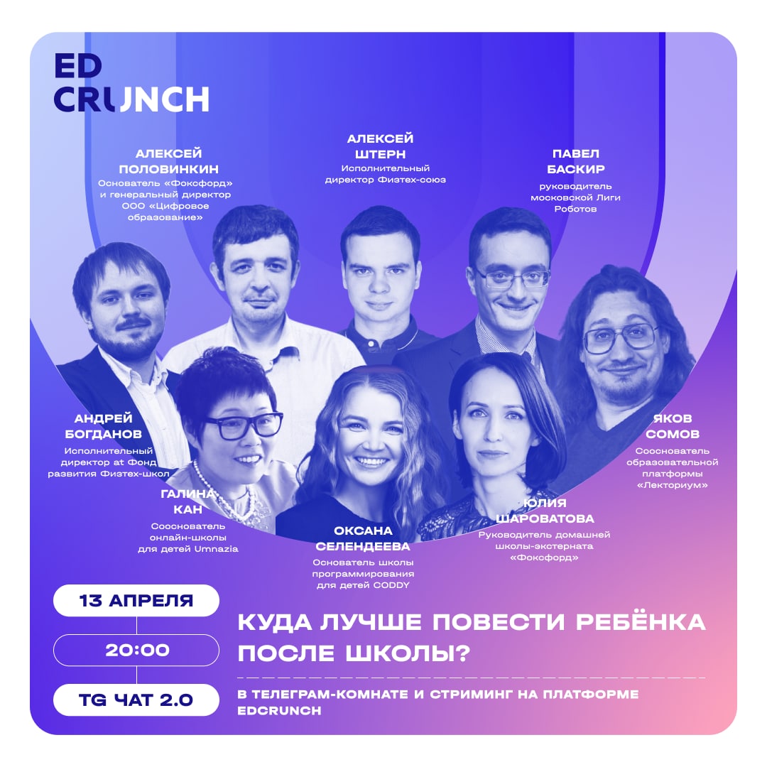 EdCrunch, Фонд развития физтех-школ, телеграм-канал DigEd и студия «Дистант ТВ» представляют новый экспериментальный формат телеграм-чата 2.0: голосовое общение в режиме «конференция» с живым интерактивным стримингом на платформе EdCrunch c возможностью задать вживую вопросы и затем посмотреть запись мероприятия в соцсетях и на Youtube канале EdCrunch.