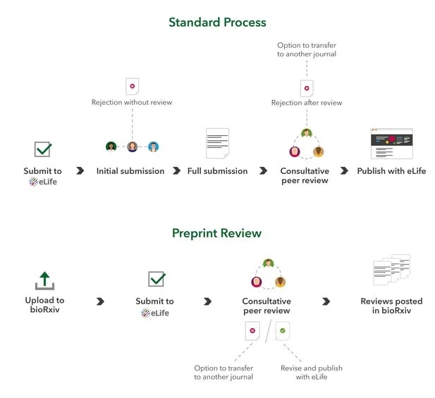 С июля 2021 года eLife будет рецензировать только рукописи, уже опубликованные в качестве препринтов, и сосредоточит свой редакционный процесс на создании публичных рецензий, которые будут размещены вместе с препринтами.