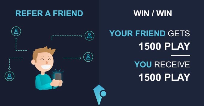 - You can earn an additional 750 PLAY for every referral who signs up, completes KYC and joins a contest and an extra 750 PLAY when the referral makes their first purchase at the platform.