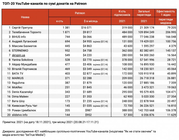 ◾Найбільше українці підтримують ютуб-канал Сергія Притули ($16 тис/місяць), на другому місці — Телебачення Торонто (майже $10 тис/місяць), третій - Bihus.Іnfo ($6 тиc/місяць). Окрім цього, канал Bihus.Іnfo став одним з лідерів зростання в 2021: аудиторія та середні показники перегляду – 490 тиc підписників та понад 166 тис переглядів.