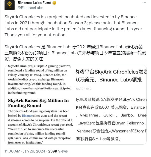 Сегодня Binance практически сразу после окончания сейла выпускают твит в котором говориться, что они не инвестили бабки в проект в 2024 году, но сам по себе инвест был, но в 21 году.