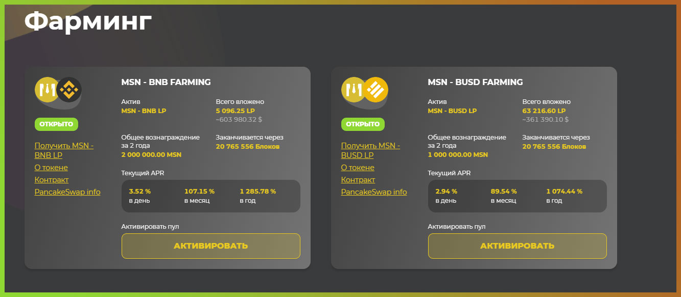• На данный момент TVL (общая сумма заблокированных средств) превысил $2.5 млн, тем не менее процент по фармингу в обоих пулах все еще составляет хороших ~3% в день. Не забывайте, если решите отправить средства в пулы фарминг/стейкинг, они блокируются на 30 дней с последующим разлоком по 2% в день. Именно поэтому и нет слива монет, т.к основной объем заблокирован и продавать токен некому.