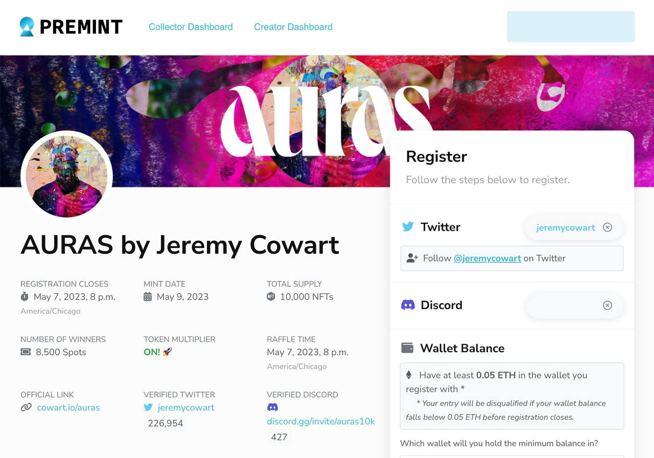 💁♂️Сейчас он планирует запустить собственную коллекцию под названием AURAS. С этим у нас выпадает возможность принять участие в раффле на 8.500NFT на Premint.