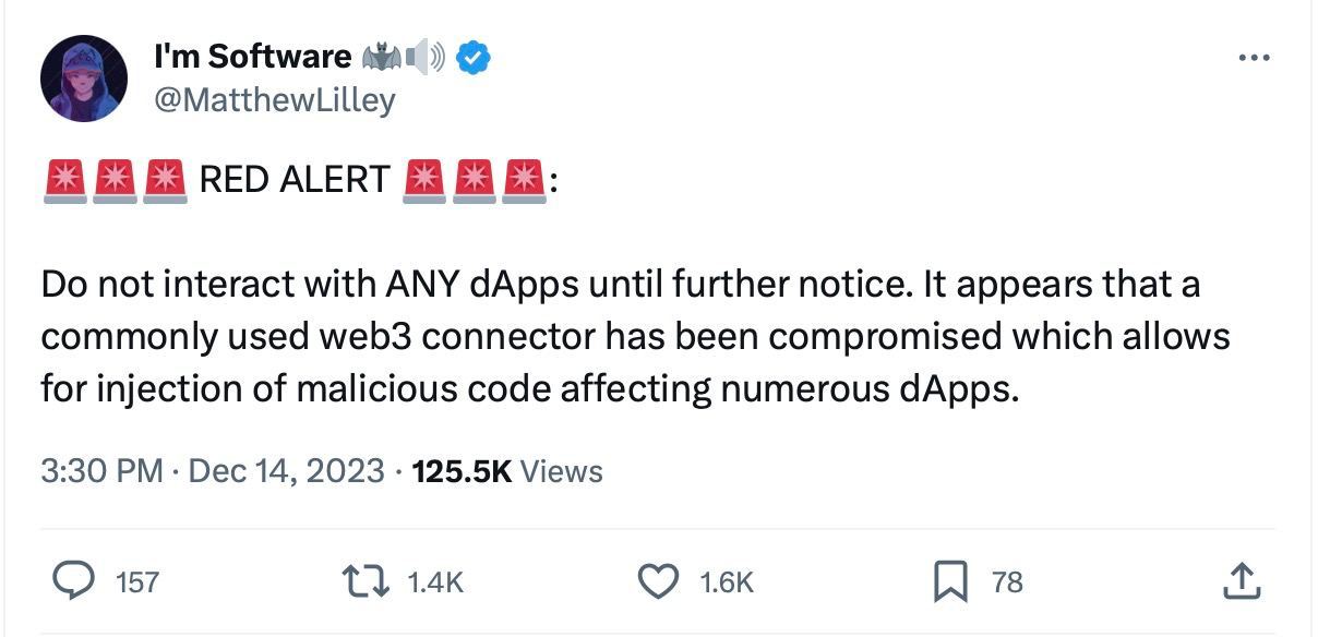 💁♂️ Web3 коннектор LedgerHQ/connect-kit, используемый множеством dapps был скомпрометирован, поэтому на время до выяснения обстоятельств воздержитесь от взаимодействия с протоколами, особенно с Zapper, SushiSwap и RevokeCash. Источник: CTO SushiSwap.