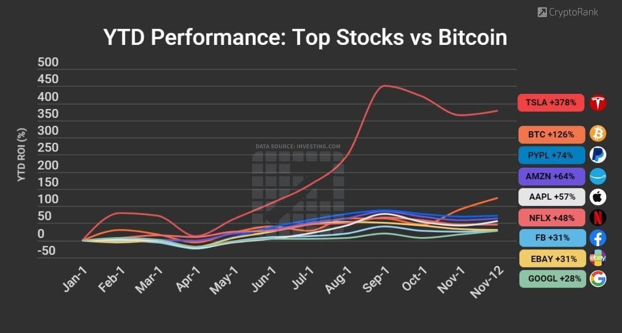 📈По некоторым данным, рост цены Биткоина в 2020 году превосходит рост акций всех ведущих компаний, за исключением Tesla.