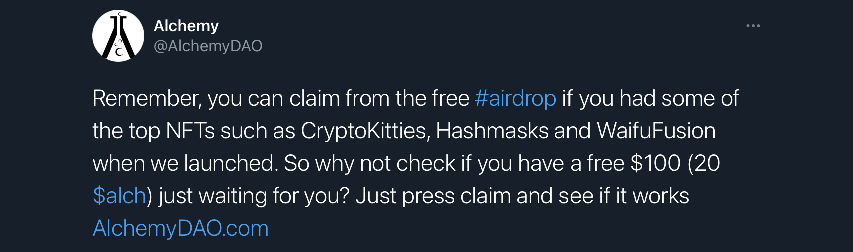 ℹ️Если у вас есть ETH-кошелек с топовыми NFT вроде Cryptokitties, Hashmasks, WaifuFusion и т.п., проверьте, возможно для вас есть аирдроп в виде 20 ALCH (50$)
