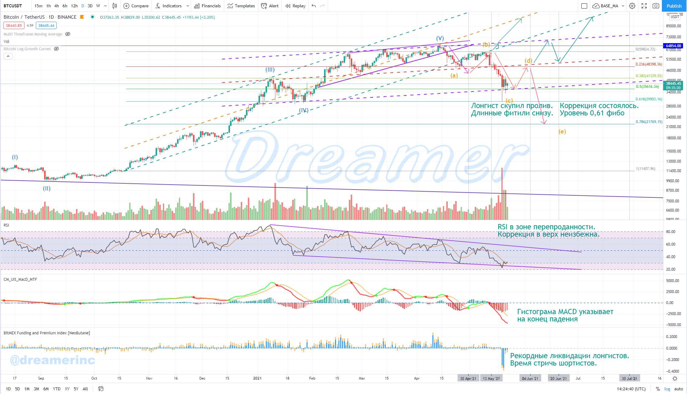 22 мая 2021: Биткоин достиг точки коррекции 0,61 по Фибоначчи, от начала параболического роста 3й волны (по Эллиоту). Коррекция произошла стремительнее и сильнее чем ожидал рынок, так обычно и бывает, тем не менее, технически коррекция отработало безупречно.