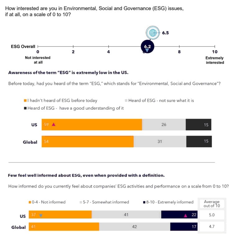 85 процентов американских респондентов в опросе, недавно опубликованном SEC Newgate , глобальной консалтинговой группой, сообщили, что либо никогда не слышали термин ESG, либо не знали, что он относится к экологическим, социальным и управленческим вопросам. И этот уровень соответствует среднему общемировому.