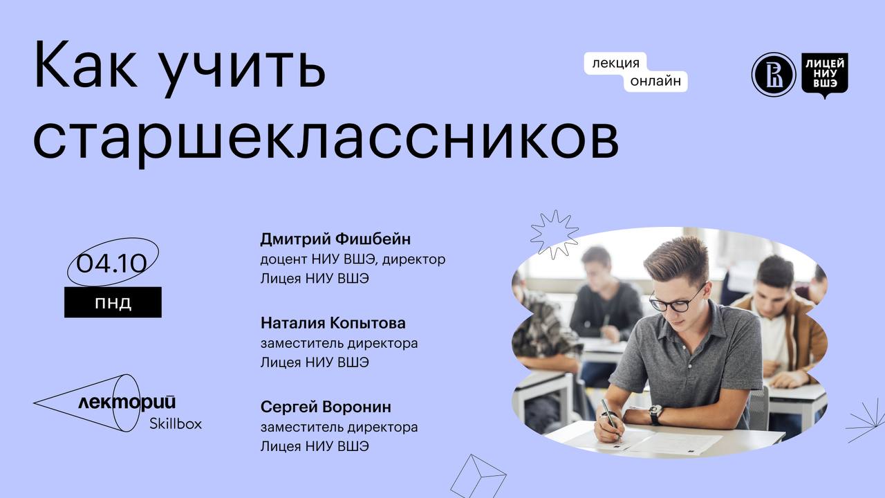Вы педагог, методист, руководитель образовательной организации? Хотите, чтобы ученики добивались высоких результатов к концу обучения? В Лектории Skillbox 4 октября будем обсуждать, как соблюсти образовательные стандарты и выстроить образовательный процесс старшеклассников на примере Лицея НИУ ВШЭ.