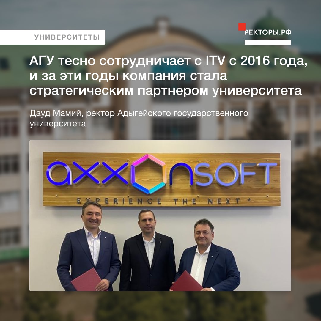 «АГУ тесно сотрудничает с ITV с 2016 года, и за эти годы компания стала стратегическим партнером университета. За пять лет представительство ITV в Майкопе превратилось в значимый для компании активно развивающийся и растущий офис разработки ПО, все сотрудники которого — выпускники и студенты АГУ».
