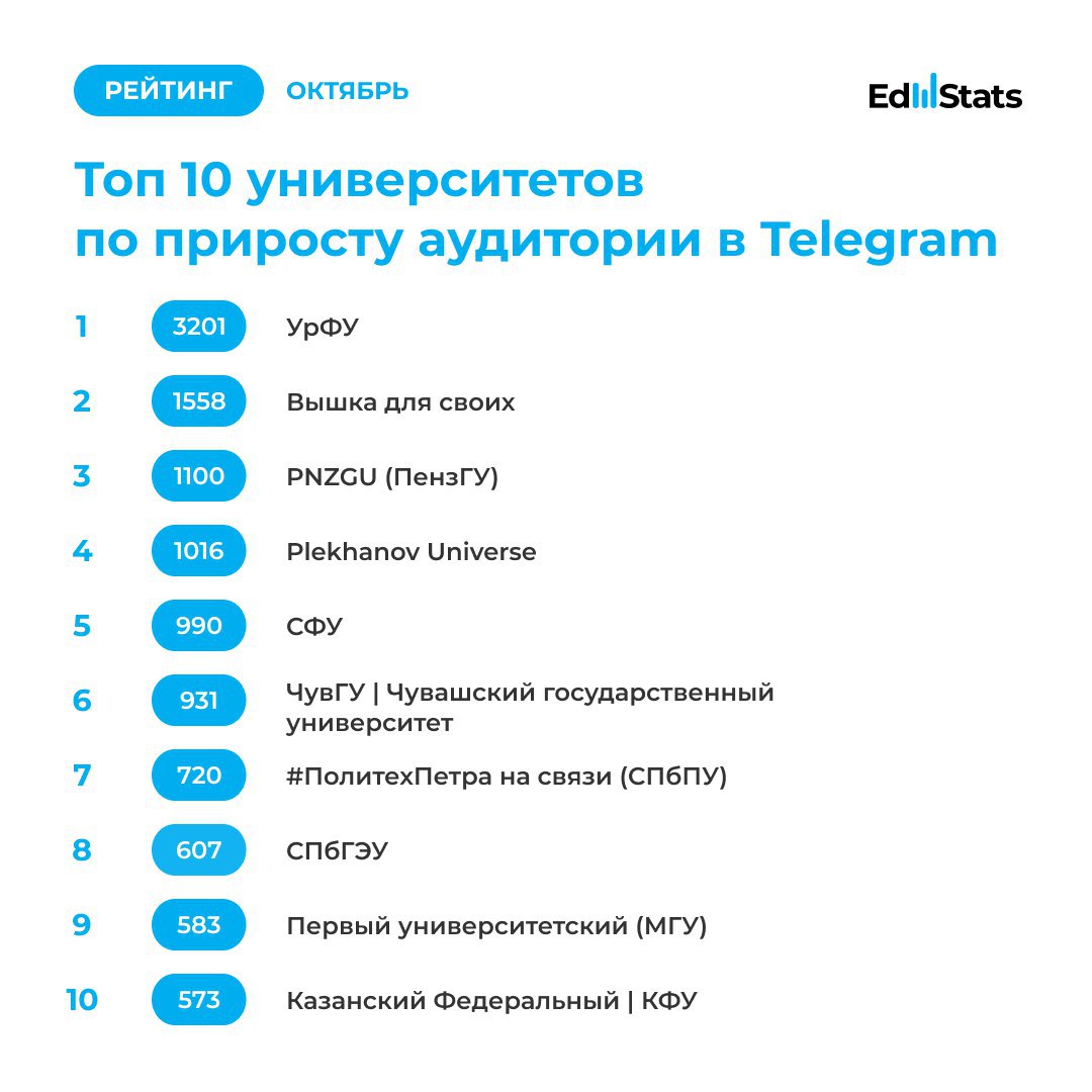 🤩 Топ 10 Telegram-каналов вузов РФ по показателю прироста аудитории (подписчиков/за месяц):