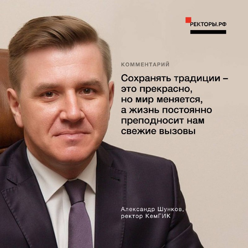 Александр Шунков во второй раз избран ректором Кемеровского государственного института культуры. За первую «ректорскую пятилетку» он существенно расширил географию мультикультурных связей вуза, интегрировав его в международный проект Erasmus +. За время руководства Шункова институт смог достичь высоких показателей в международных рейтингах, поднять конкурс среди абитуриентов до 5,6 человека на место, а также стать участником федерального проекта «Творческие люди» Национального проекта «Культура». Вторая «пятилетка» на посту только стартовала, но уже обещает быть продуктивной: лицензированы новые специальности, преподаватель вуза признан лучшим лектором страны, а монография самого ректора вошла в тройку лучших на областном конкурсе.