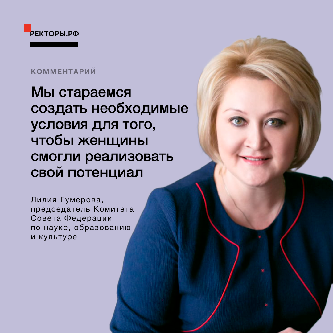 В отечественной науке порядка 39 % женщин-ученых, в мире в целом – менее 30 %. В ряде стран квотируется участие женщин в науке, политике, экономике. Мы придерживаемся другого подхода – мы не квотируем. А стараемся создать необходимые условия для того, чтобы женщины смогли реализовать свой потенциал».