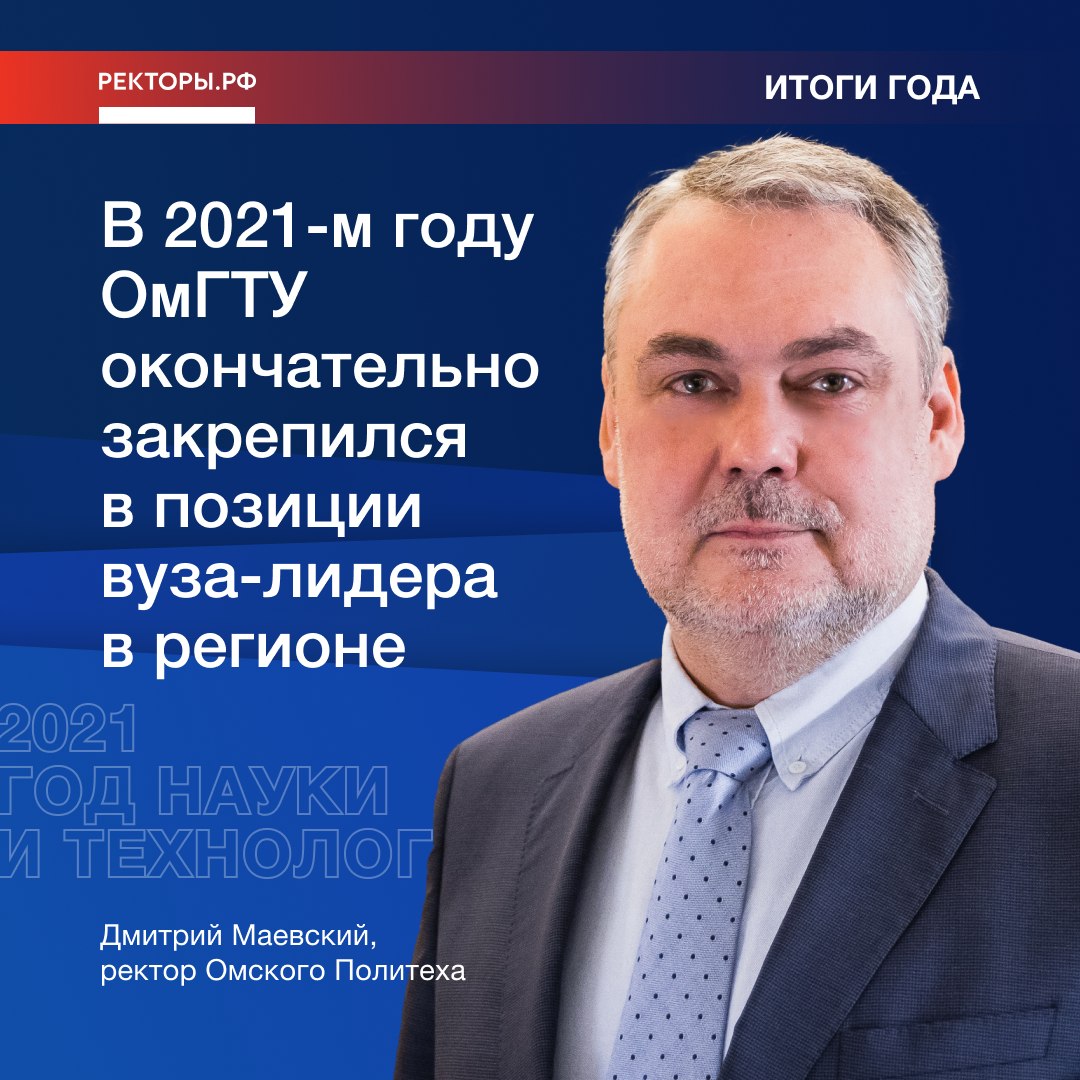 В 2021-м году ОмГТУ окончательно закрепился в позиции вуза-лидера в регионе, который понимает и принимает всю ответственность, связанную не только с подготовкой кадров и научными разработками, а также всецело вписывается в его социально-экономическое развитие. Университет проявляет все большую готовность решать задачи регионального масштаба. Наши проекты и разработки совместно с предприятиями должны привести к созданию новых производств, высокотехнологичных рабочих мест, стать точкой притяжения молодых талантов, решить проблему миграционного оттока.