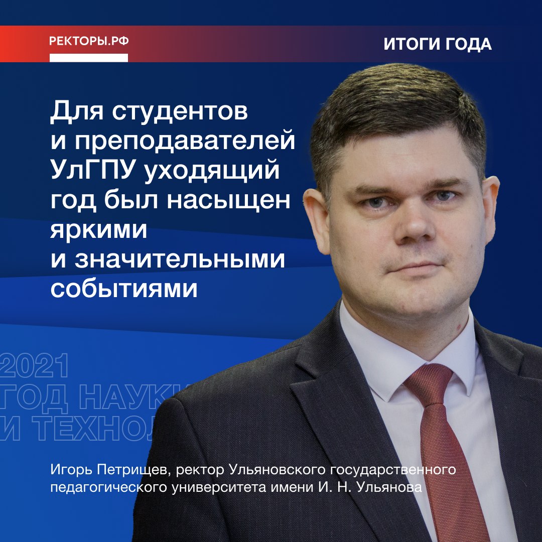 «Главное событие уходящего года — это масштабная модернизация материально-технической базы университета благодаря программе Министерства просвещения РФ „Учитель будущего поколения России“. Технопарк универсальных педагогических компетенций, официальное открытие которого произойдет совсем скоро, поможет качественно улучшить междисциплинарную практическую подготовку будущих педагогов. Возможности технопарка будут использоваться и для проведения занятий со старшеклассниками лицея УлГПУ, партнерских школ распределенного лицея, а также для повышения квалификации действующих учителей школ Ульяновской области.